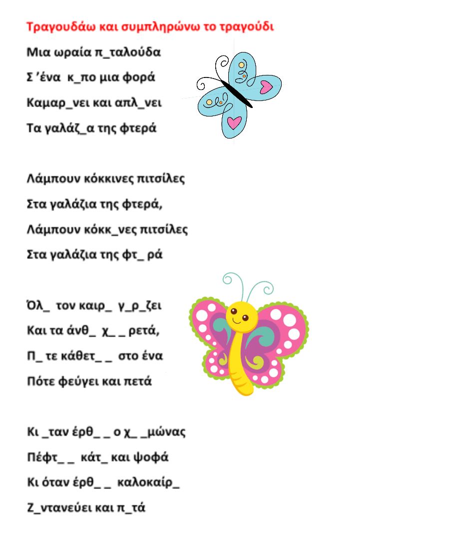 Αρχικά ακούσαμε τα τραγούδια και στη συνέχεια συμπληρώσαμε τα κενά στους στίχους ανακαλώντας τους κανόνες γραμματικής και ορθογραφίας.