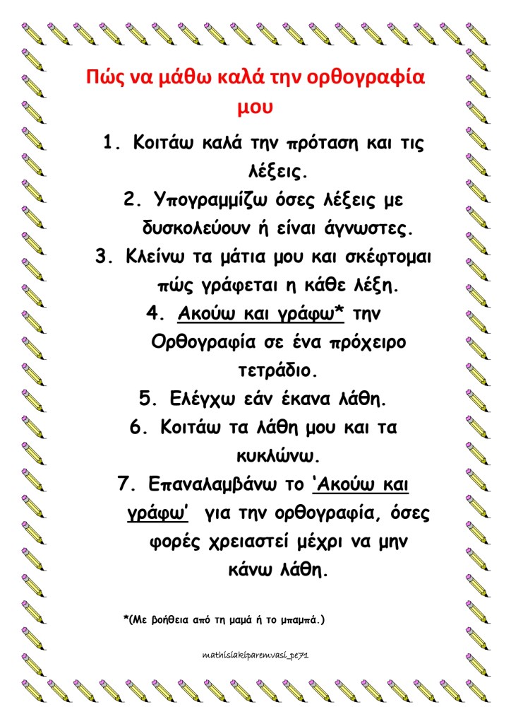 Ένας τρόπος απομνημόνευσης και εκμάθησης της Ορθογραφίας είναι ακολουθώντας την παρακάτω διαδικασία: