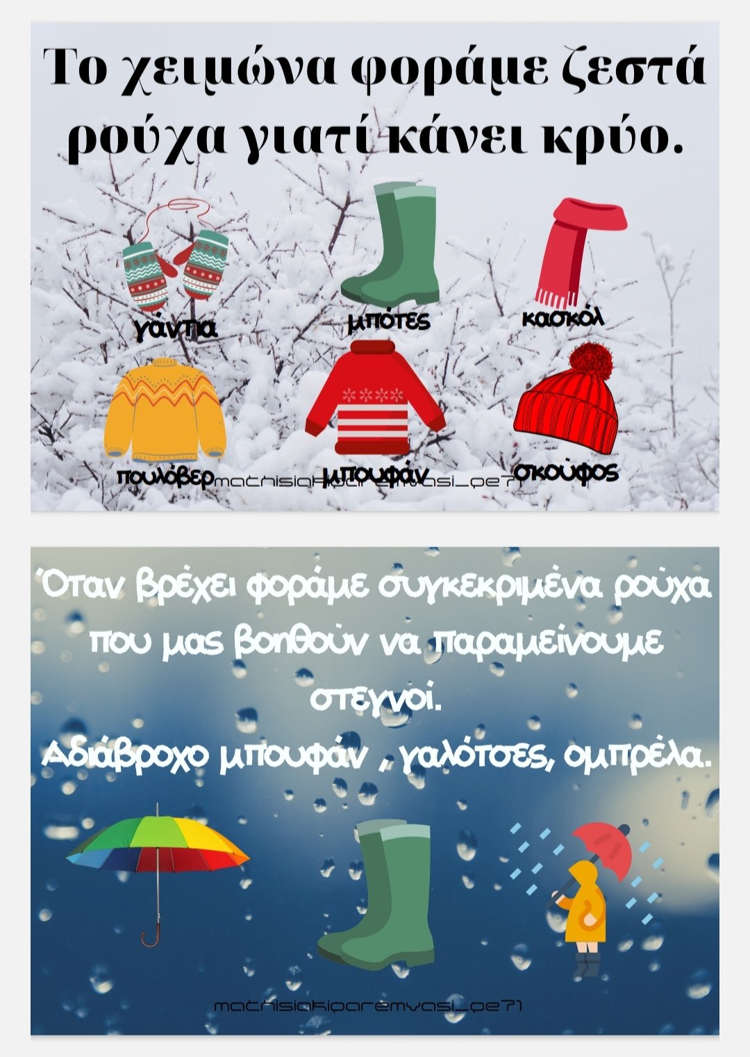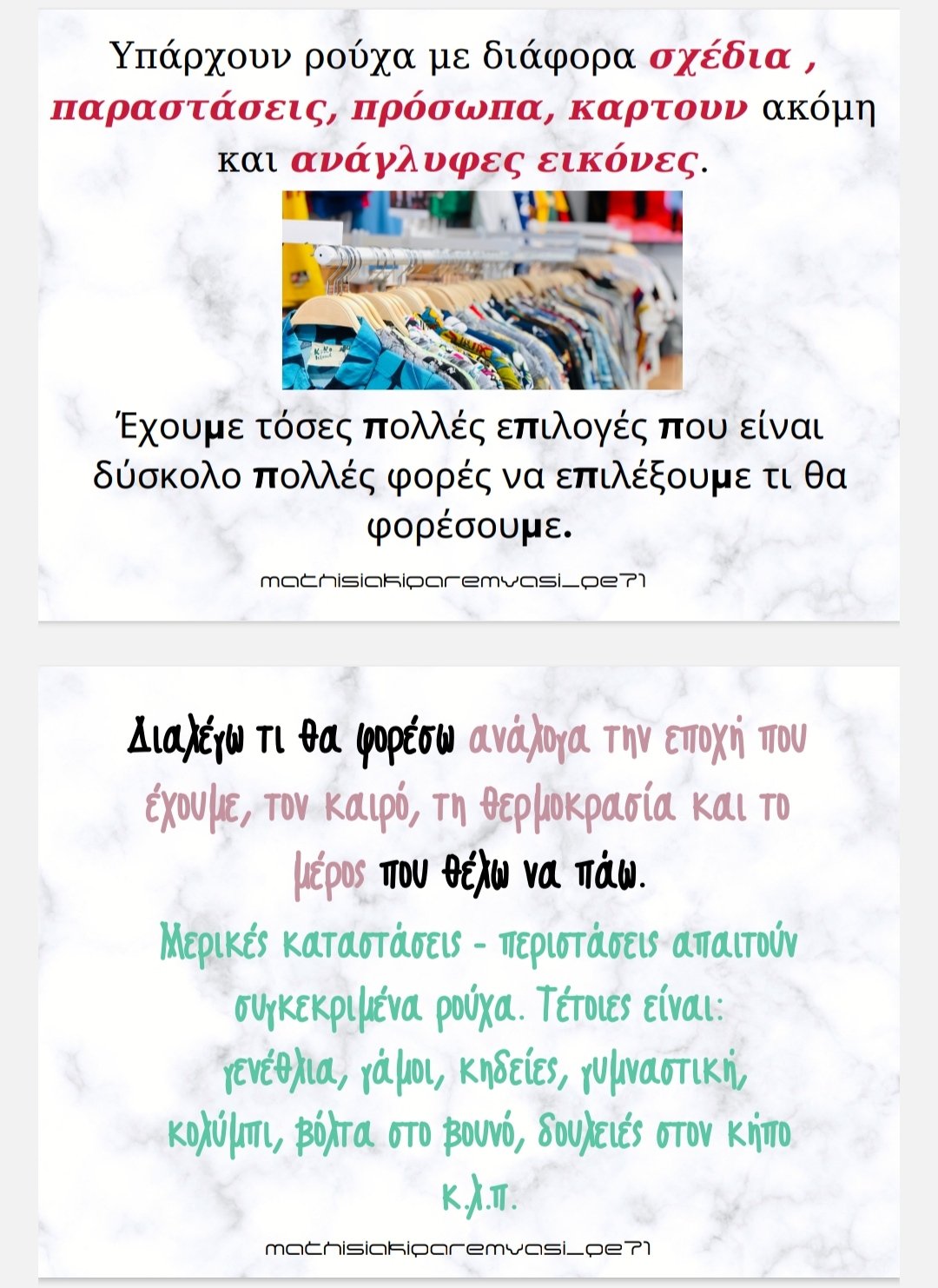 Δεν πρόκειται ακριβώς για κοινωνική ιστορία αλλά με αφορμή αυτές τις καρτέλες που μπορούν να γίνουν βιβλιαράκι, να γίνει συζήτηση με το παιδί προκειμένου να κατανοήσει και να δεχτεί την αλλαγή των ρούχων για κάθε περίπτωση/περίσταση.