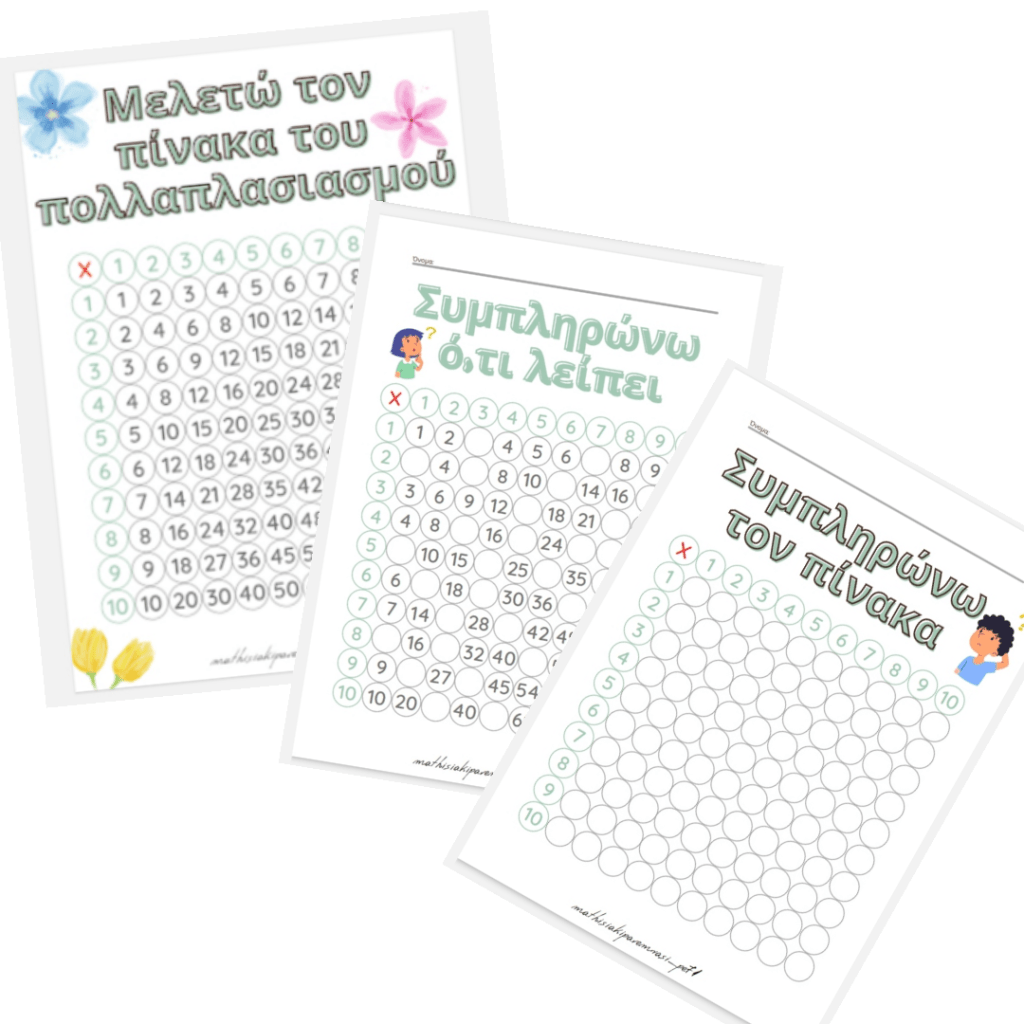 ✨ Στο πρώτο φύλλο είναι ο πίνακας του πολλαπλασιασμού συμπληρωμένος. Στο δεύτερο φύλλο λείπουν κάποιοι αριθμοί ενώ στο τρίτο λείπουν όλοι.