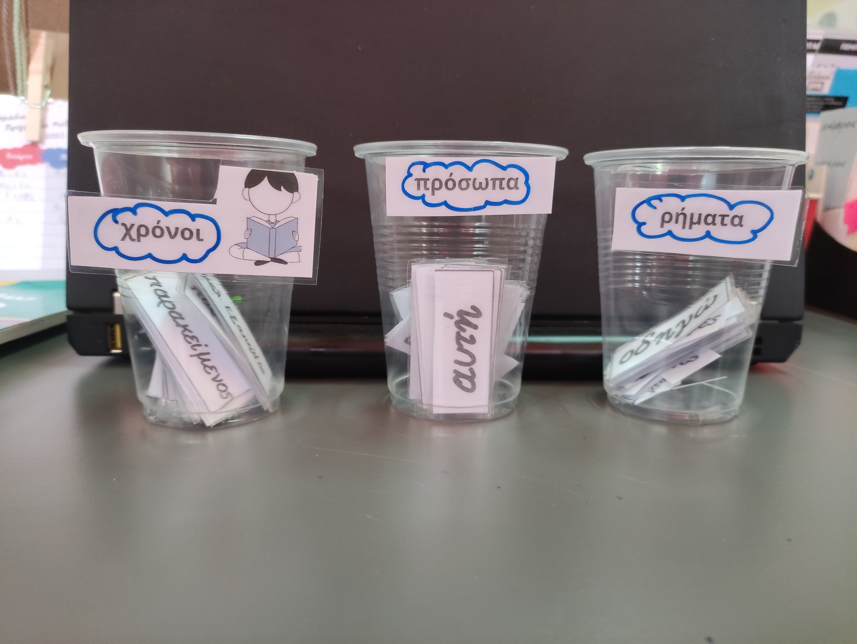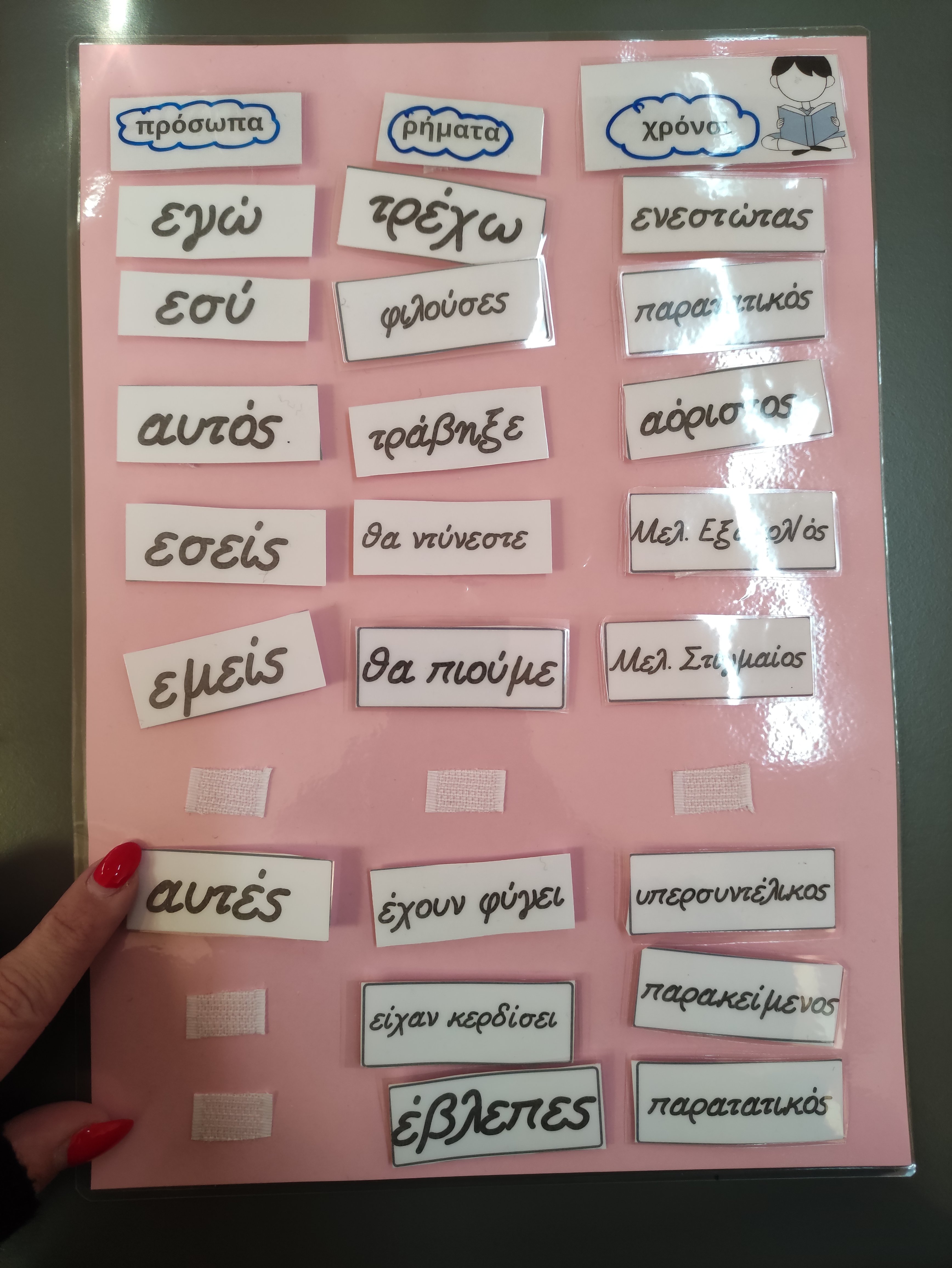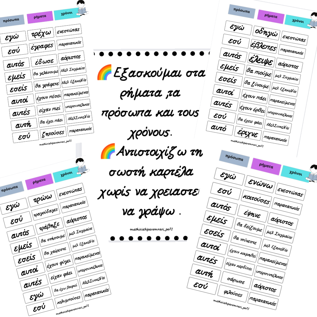 👉Δημιούργησα αυτή τη δραστηριότητα καθώς έχω κάποιους μαθητές που… μισούν 😁 το γράψιμο, όπως λένε. Οπότε αντί να γράφουμε θα κάνουμε χρονική αντικατάσταση, αναγνώριση και αντιστοίχιση προσώπων και χρόνων, με καρτελάκια που θα περιέχουν αυτά που χρειαζόμαστε.