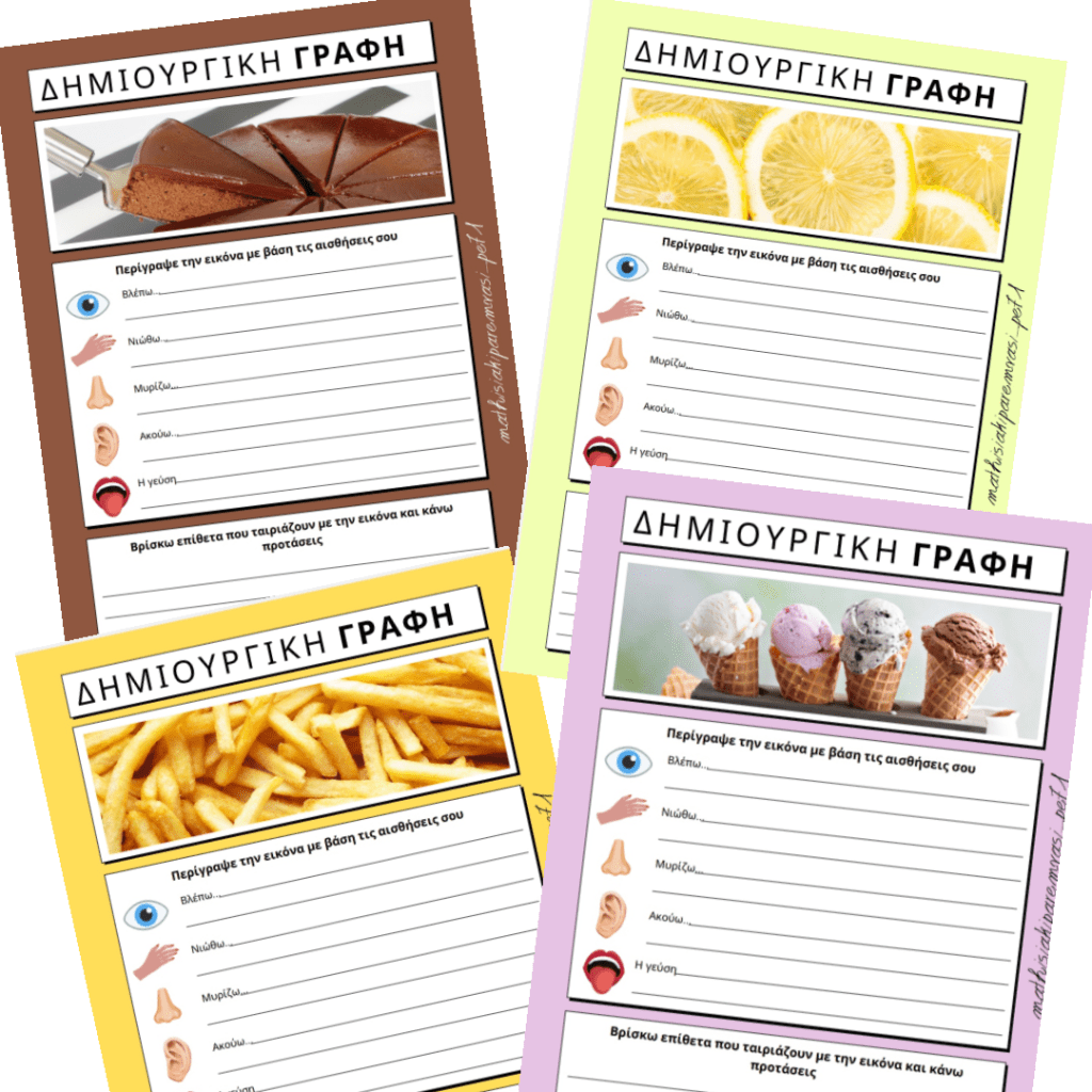Φύλλα εργασίας για παραγωγή γραπτού λόγου και ταυτόχρονη περιγραφή των αισθήσεων. Εύρεση και χρήση των αντίστοιχων επιθέτων.