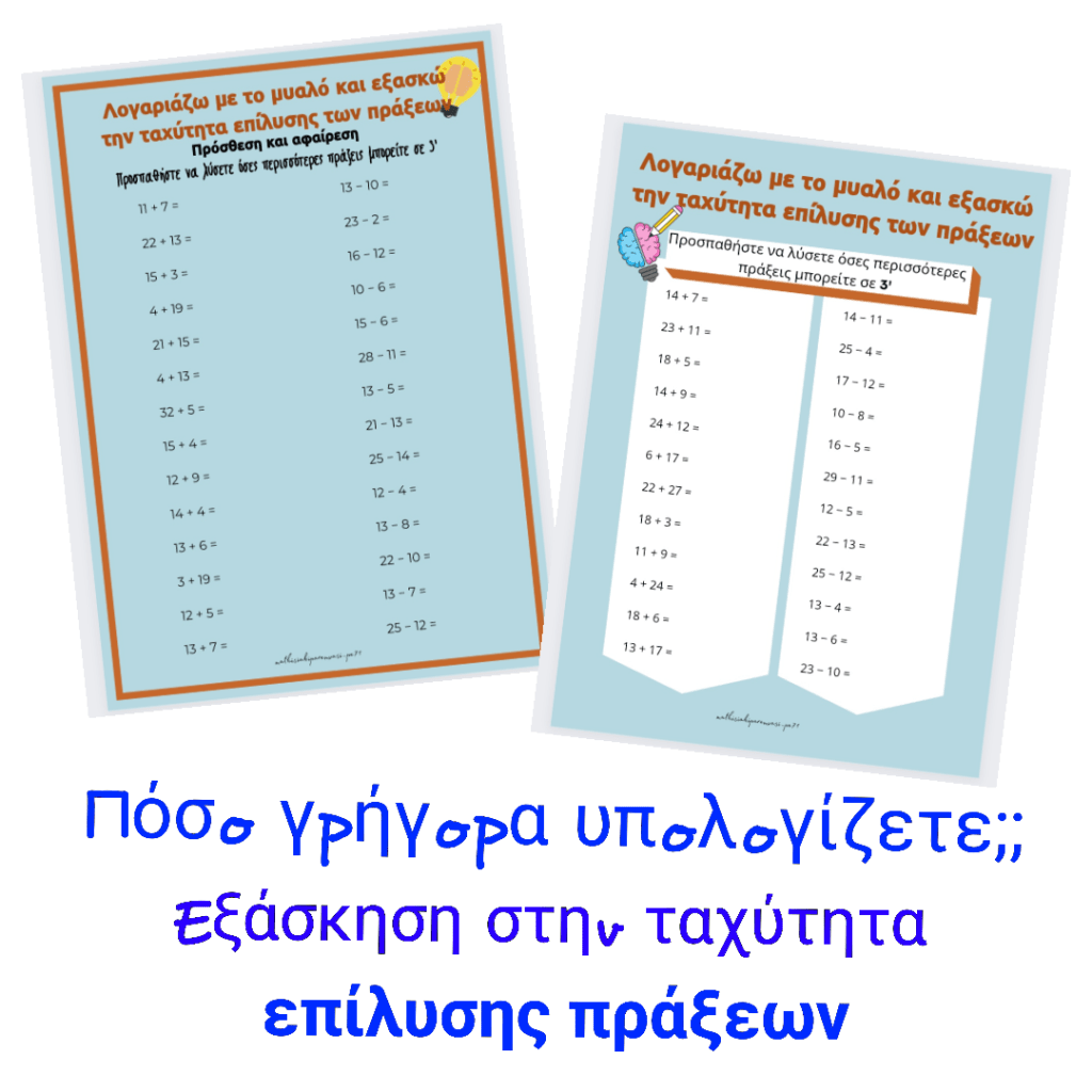Δύο φύλλα εργασίας για εξάσκηση στην πρόσθεση και αφαίρεση και αύξηση της ταχύτητας υπολογισμού με το νου.