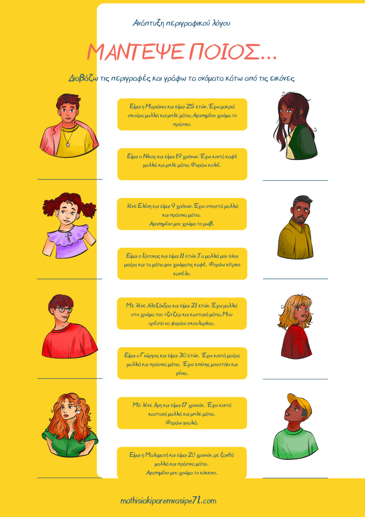 Ένα φύλλο εργασίας όπου περιγράφονται οι εξωτερικές εμφανίσεις ατόμων και πρέπει ο μαθητής να τις διαβάσει, κατανοήσει και αντιστοιχίσει με το σωστό πρόσωπο/εικόνα.
