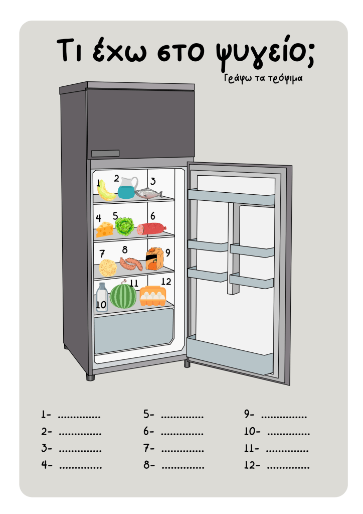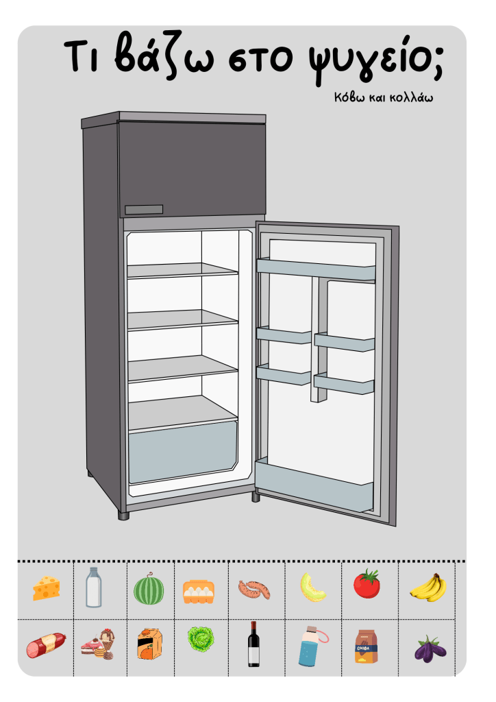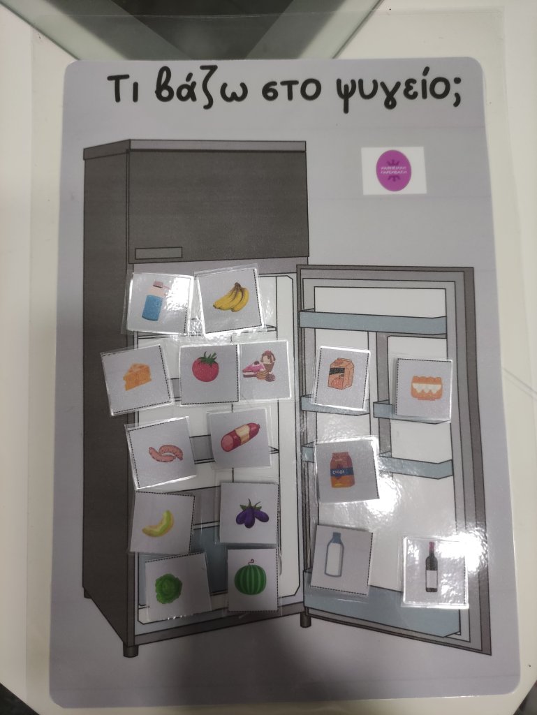 Αυτή η δραστηριότητα είναι πολύ χρήσιμη για μαθητές με νοητική υστέρηση και αυτισμό ,όπου θέλουμε να πετύχουμε την ονομασία των προϊόντων,την νοητική ανάπτυξη και την παραγωγή γραπτού λόγου. Επίσης είναι μια πολύ καλή ευκαιρία ανάπτυξης της λεπτής κινητικότητας με το αυτοκόλλητο βέλκρο σκριτς σκρατς.