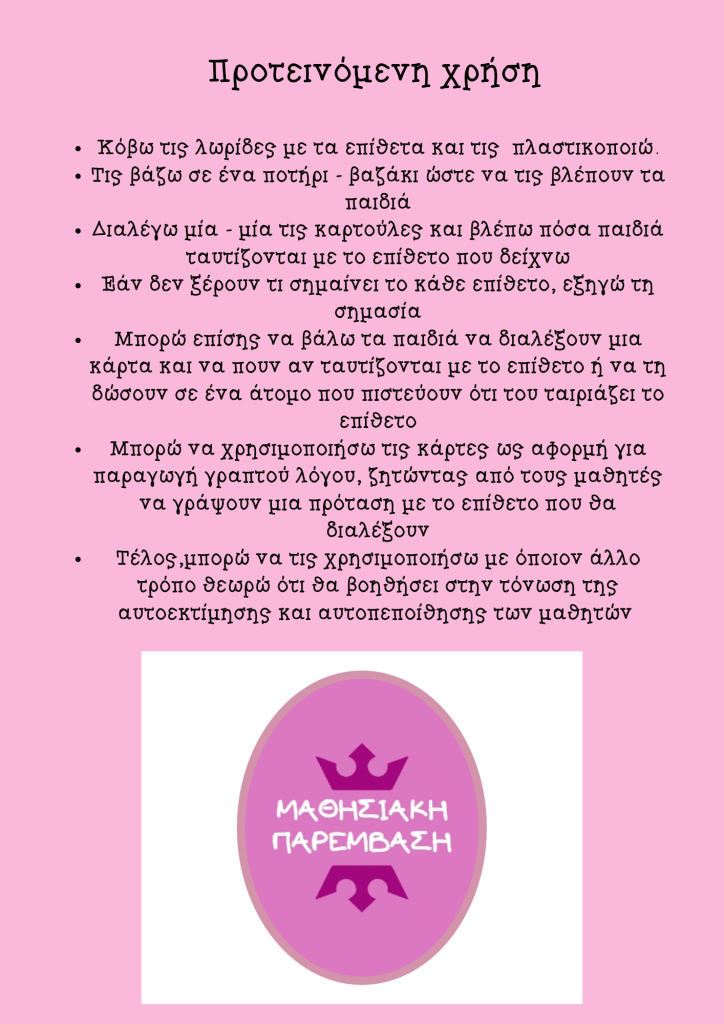 Στα πλαίσια της ψυχικής ενδυνάμωσης και της δημιουργίας θετικής αυτοεικόνας , μπορούμε να κάνουμε την παρακάτω δραστηριότητα με επίθετα.