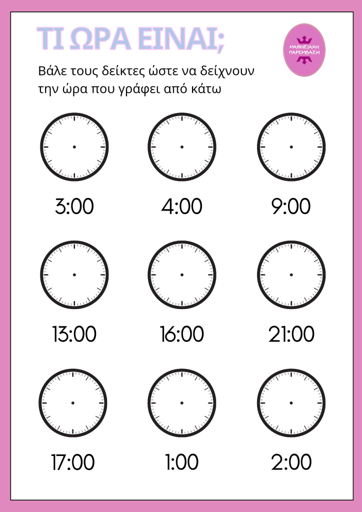 Φύλλα εργασίας για την εξάσκηση στην εκμάθηση της ώρας.