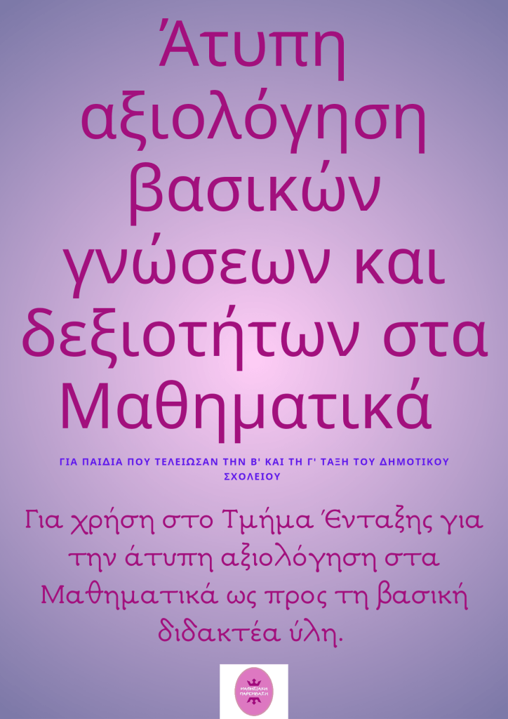 👉Απευθύνεται σε μαθητές που θα φοιτήσουν στο Τμήμα Ένταξης και περιλαμβάνει ασκήσεις για την ανίχνευση του επιπέδου κατάκτησης της βασικής ύλης της Β και της Γ δημοτικού και προσδιορισμού έτσι του μαθησιακού επιπέδου του παιδιού και των αναγκών του .