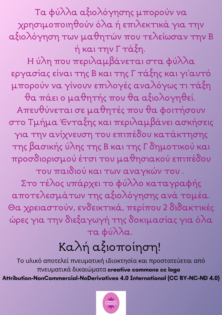 👉Η ύλη που περιλαμβάνεται στα φύλλα εργασίας είναι της Β και της Γ τάξης και γι’ αυτό μπορούν να γίνουν επιλογές αναλόγως τι τάξη θα πάει ο μαθητής που θα αξιολογηθεί.