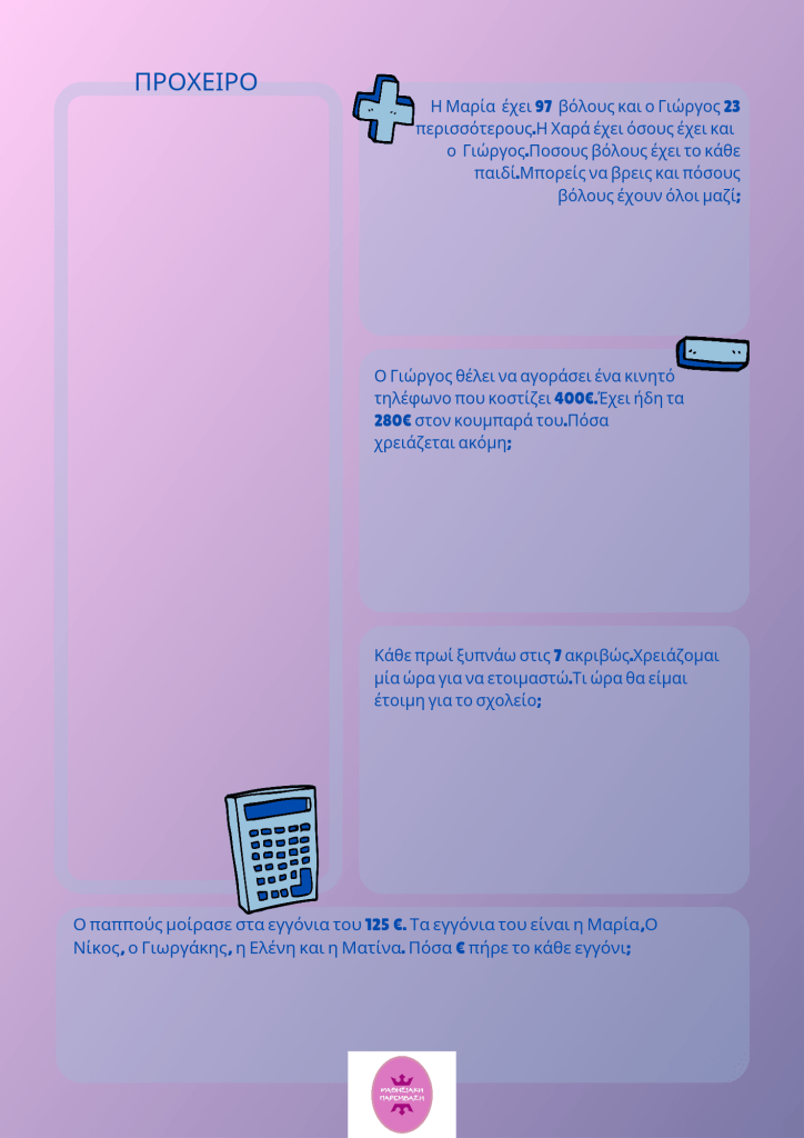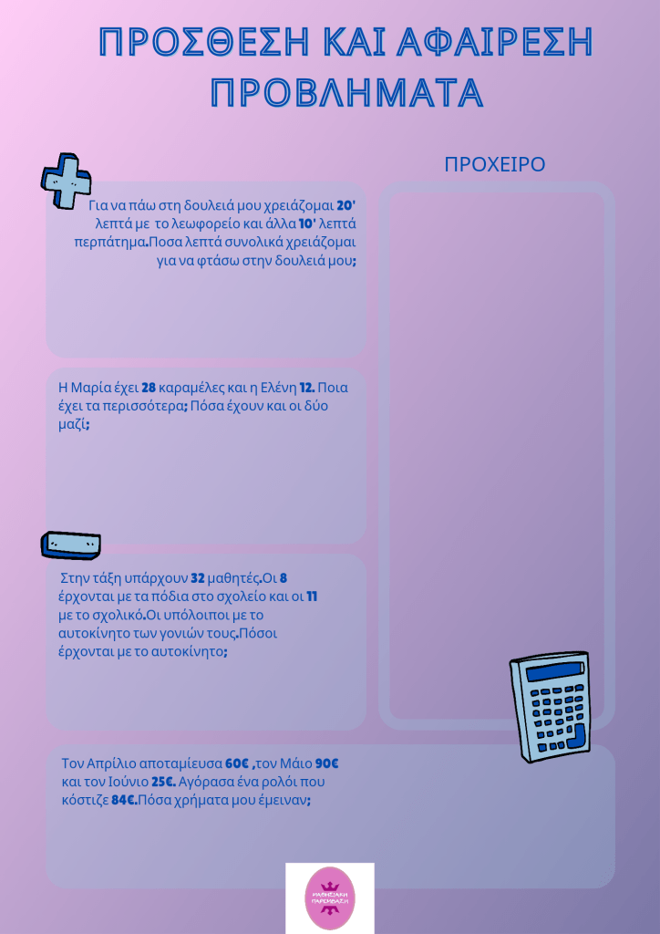 – Πράξεις πρόσθεσης και αφαίρεσης με αριθμούς μονοψήφιους, διψήφιος και τριψήφιους