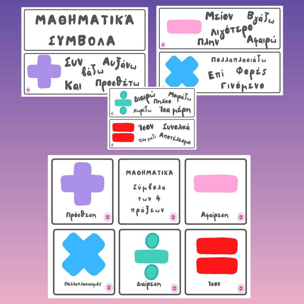 Εκτυπώσιμες κάρτες με τα σύμβολα των πράξεων και το ίσον. Λέξεις κλειδιά που συνδέονται με το κάθε σύμβολο – πράξη.