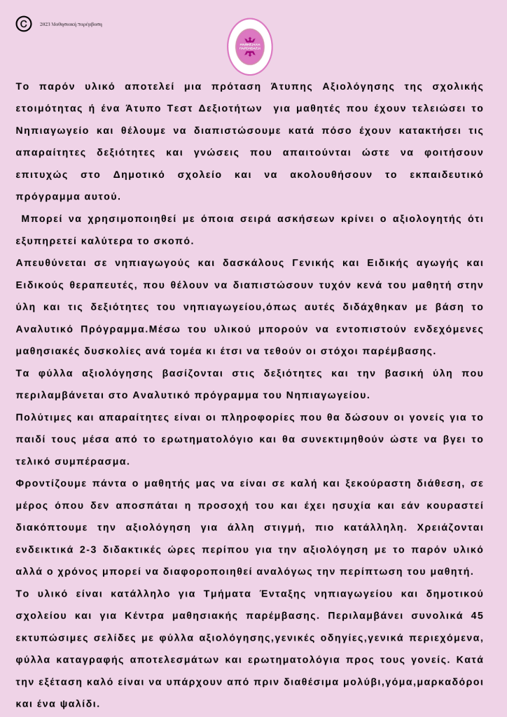 🎈Η άτυπη αξιολόγηση στις δεξιότητες και γνώσεις του Νηπιαγωγείου μπορεί να χορηγηθεί από νηπιαγωγούς Γενικής και Ειδικής αγωγής, δασκάλους Γενικής και Ειδικής αγωγής, και Ειδικούς θεραπευτές.