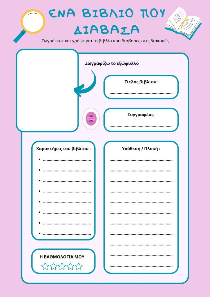 Σκέφτηκα λοιπόν, γυρνώντας από τις διακοπές να ετοιμάσω ένα φύλλο παραγωγής γραπτού λόγου με αφορμή ένα βιβλίο που θα έχει διαβάσει ο κάθε μαθητής στη διάρκεια των διακοπών. Να γίνει μια επισκόπηση αυτού και στο τέλος να αφήσει και την βαθμολογία του ⭐